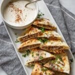The image shows a white, rectangular plate with five triangular pieces of stuffed flatbread, each folded over a brown meat filling. The flatbread has a light golden color with grill marks and a slightly crispy texture. Fresh green herbs are scattered on top of the flatbread pieces, adding color contrast. At the top of the plate, there is a white bowl with a creamy white sauce sprinkled with a few dark red spices, and a silver spoon resting inside the bowl. The plate is placed on a soft gray cloth with white stripes, all set on a white marbled surface. photo taken with an iphone --ar 4:5 --v 7