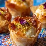 - Cool and Garnish: Remove from the oven and allow the filo rounds to cool for 5 minutes in the pan. Carefully remove each piece and transfer to a serving tray. Drizzle with honey, sprinkle with additional crushed pistachios and edible rose petals if using, and serve warm for the best flavor and texture.