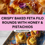 This elegant baked feta recipe features creamy sheep’s milk feta wrapped in crisp phyllo rounds, layered with sweet jam and crunchy pistachios, then drizzled with honey and garnished with edible rose petals. Perfect for an appetizer or a stylish snack, these delicate filo rounds are golden and flaky, offering a delightful blend of savory, sweet, and nutty flavors.