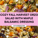 Keywords: Fall salad, roasted vegetable salad, orzo salad, autumn harvest salad, maple balsamic dressing, butternut squash, brussels sprouts