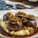 Bobby Flay’s Salisbury Steak is a classic American comfort dish featuring juicy beef patties cooked to medium rare and smothered in a rich mushroom gravy. This hearty recipe combines ground beef mixed with Parmesan, garlic, and breadcrumbs, seared to perfection then simmered in a savory sauce of mushrooms, onions, tomato paste, and Worcestershire sauce finished with a splash of half and half for creaminess. It’s an easy stovetop meal perfect for weeknight dinners that delivers satisfying flavors and a home-cooked feel.