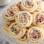 - Pipe the Cookies: Transfer the dough into a piping bag and pipe small circles onto the prepared baking sheet. If desired, sprinkle with colorful sprinkles for decoration. Once piped, chill the baking sheets in the refrigerator for 20-30 minutes to firm up the dough.