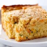 The image shows a single thick rectangular piece of cornbread placed on a white plate with a white marbled surface below. The cornbread has a soft, crumbly texture with a golden-brown crust on the top and edges. Inside, it is light yellow with visible bits of orange, likely small pieces of vegetables or corn, and some green specks scattered throughout. The top surface is slightly uneven and cracked, showing the moist texture inside. Photo taken with an iphone --ar 4:5 --v 7