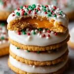 A stack of four round cookies with light golden edges is shown, each topped with a smooth, glossy white icing layer. The icing is decorated with small, round, red, green, and white sprinkles that add a festive look. The top cookie has a bite taken out of it, revealing a soft, gooey, bright orange filling inside that contrasts with the crumbly cookie. The cookies are arranged on a white marbled surface with a shallow depth of field that focuses closely on the textures. photo taken with an iphone --ar 4:5 --v 7