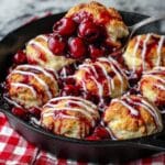 This Cast Iron Skillet Cherry Cobbler is a quick and delightful dessert featuring flaky biscuits layered over sweet cherry pie filling, baked to golden perfection. Topped with a smooth cream cheese glaze, it’s perfect served warm with ice cream or whipped cream for a comforting treat.