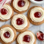 9. Add jam topping: Using two small spoons, carefully place a dollop of your chosen jam or preserves in the center of the frosting on each cookie to complete the cheesecake cookie.