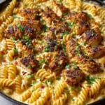 This Cheesy Cajun Garlic Chicken Rotini Skillet is a flavorful one-pan pasta dish featuring tender Cajun-seasoned chicken and a rich, creamy garlic cheese sauce. It’s perfect for a hearty weeknight dinner with a spicy kick and gooey melted cheese all tossed with rotini pasta.