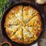 Keywords: focaccia, cheesy garlic bread, Italian bread, garlic bread, mozzarella, cheddar, parmesan, skillet bread, savory appetizer, focaccia recipe