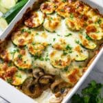 This Chicken Zucchini Casserole is a hearty and flavorful dish combining tender seared chicken, sautéed mushrooms, onions, and zucchini in a creamy cheese sauce. Baked to perfection with melted Gruyere cheese on top, it offers a comforting and low-carb meal perfect for family dinners or meal prep.