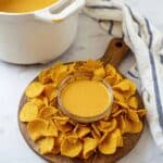 A round wooden board holds a small clear bowl filled with a smooth orange cheese dip, surrounded by a thick layer of curved, crunchy, yellow-orange corn chips that have a slightly rough and crispy texture. The board rests on a white marbled surface next to a white crockpot with more of the same creamy orange cheese dip inside. A white cloth with thin navy blue stripes lies folded near the crockpot, adding a soft touch to the scene. Photo taken with an iphone --ar 4:5 --v 7