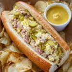 This Chopped Grinder Sandwich is a flavorful combination of pre-cooked pulled pork, ham, Swiss cheese, dill pickles, and mustard all finely chopped together and layered inside buttered, toasted submarine rolls. The rolls are brushed with a savory garlic parsley butter, toasted under the broiler for a perfect golden finish, and then generously filled with the chopped meat mixture, making for a hearty, satisfying sandwich that’s perfect for lunch or dinner.