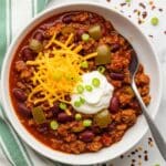 - Serve: Ladle the chili into bowls and serve with your favorite toppings such as shredded cheddar cheese, spicy chili flakes, sour cream, chopped green onions, cilantro or parsley, and crunchy fritos or tortilla chips.