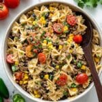 A large white bowl filled with a colorful pasta salad featuring several layers: the base layer is light beige farfalle pasta with a smooth texture, mixed with browned ground meat. Scattered throughout are small bright yellow cubes of cheese, shiny black beans, and bits of yellow corn adding pops of color. Halved cherry tomatoes in vibrant red and small green chopped herbs sprinkle the top, giving a fresh look. A wooden spoon with a dark brown handle rests inside the bowl, partly covered by the salad. The bowl sits on a white marbled surface with some red tomatoes and two green jalapeños nearby. photo taken with an iphone --ar 4:5 --v 7