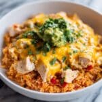 A close-up view of a dish served in a white bowl featuring three main layers. The bottom layer consists of orange-colored Mexican rice with small red and green pieces mixed in, giving it a textured look. On top of the rice, there are chunks of cooked chicken scattered evenly, showing a light beige color with a tender texture. The top layer is melted yellow cheese, spread over the chicken and rice, adding a creamy and slightly glossy finish. Small green dollops of guacamole and fresh chopped cilantro are sprinkled on top, adding pops of green color and freshness. The bowl sits on a white marbled surface. photo taken with an iphone --ar 4:5 --v 7