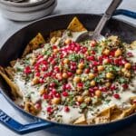 6. Assemble and Garnish: In a serving dish, layer the crispy pita chips, then generously spoon over the warm, runny hummus yogurt mixture. Sprinkle with the toasted pine nuts, chopped fresh parsley, and juicy pomegranate seeds. Optionally, dust the top lightly with paprika or Aleppo pepper for an extra burst of color and mild heat. Drizzle with olive oil before serving.
