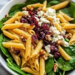 A refreshing and vibrant penne salad featuring creamy feta cheese, sweet dried cranberries, crunchy toasted walnuts, and fresh baby spinach, all tossed in a zesty homemade orange vinaigrette. Perfect as a light lunch or a delightful side dish.