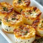 The image shows eight small round bites arranged closely on a white rectangular plate with rounded edges, placed on a white marbled surface. Each bite has two main layers: a golden brown, crispy outer edge and top layer with a slightly uneven, toasted texture, and a soft creamy white middle layer that looks smooth with some small curds visible. Each bite is garnished with small specks of fresh green herbs on top, adding a subtle color contrast. The overall look is warm and inviting with a balance of toasted crispiness and creamy softness, making the bites appear freshly cooked and ready to eat. Photo taken with an iphone --ar 4:5 --v 7
