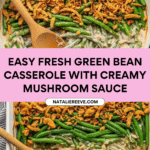 This Fresh Green Bean Casserole recipe elevates the classic side dish with crisp-tender fresh green beans combined with a savory mushroom cream sauce, topped with crunchy fried onions, and baked to perfection for a comforting and flavorful addition to any meal.