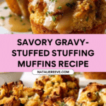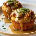 Keywords: stuffing muffins, gravy stuffed muffins, Thanksgiving side dish, sausage gravy, holiday stuffing, baked stuffing, savory muffins