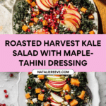 Keywords: kale salad, roasted vegetables, butternut squash, cauliflower, tahini dressing, autumn salad, healthy salad, fall recipe, maple tahini, pepitas, pomegranate