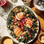 This Harvest Kale Salad with Maple-Tahini Dressing combines the earthiness of roasted cauliflower and butternut squash with the bright freshness of kale and pomegranate arils. It’s a satisfying and nutritious salad that celebrates autumn flavors with a creamy, tangy dressing.