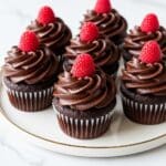 The image shows several chocolate cupcakes placed on a round, white plate with a subtle golden rim, set on a white marbled background. Each cupcake has one layer of dark chocolate cake topped with a thick, swirled layer of rich, glossy dark chocolate frosting. On top of each frosting swirl sits a single bright red raspberry, adding a fresh pop of color and texture to the dark brown tones of the cupcake and frosting. The overall look is neat and inviting, with the cupcakes closely arranged but still showing individual details. Photo taken with an iphone --ar 4:5 --v 7