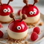 Three small round cakes are placed on a white plate with a light brown edge, set on a white marbled surface. Each cake has two main layers: the bottom layer is a smooth, creamy white dome shape with a soft texture, while the top layer is a bright red, shiny, rounded cap covering part of the dome. On top of the red layer, there are two white circular eyes with small black dots in the center, resembling cartoon eyes. Protruding from the red layer are two brown, stick-like antennae with rounded tips, dusted with cocoa powder. Around the cakes, there are scattered pieces of crunchy light brown crumbs and fresh red raspberries adding color contrast. photo taken with an iphone --ar 4:5 --v 7