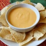A white bowl filled with smooth, light orange cheese sauce sits in the center of a white plate. Surrounding the bowl are several light beige, triangular tortilla chips with a slightly rough texture. The plate is placed on a surface with a red and orange striped pattern, and a green cloth napkin is partially visible in the background. photo taken with an iphone --ar 4:5 --v 7