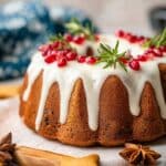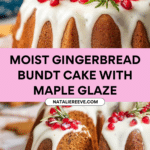 This Moist Gingerbread Bundt Cake is a rich, spiced dessert perfect for the holiday season or any cozy gathering. Featuring warm ginger and allspice flavors, tender crumb, and a tangy lemon-maple glaze, this cake is beautifully adorned with fresh rosemary sprigs and pomegranate seeds for a festive finish.