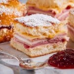 5. Finish and Serve: Remove the sliders from the oven and let them cool for 5 to 10 minutes to set. Using the parchment paper handles, carefully lift the entire slab of sliders onto a cutting board and cut into individual sliders with a sharp knife. Dust the tops generously with powdered sugar and serve warm alongside raspberry preserves for dipping.