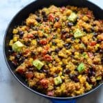 One Pan Mexican Quinoa is a vibrant, wholesome dish featuring protein-packed quinoa cooked with black beans, fire-roasted tomatoes, corn, and aromatic spices. Finished with creamy avocado, fresh lime juice, and cilantro, this easy-to-make, nutritious meal is perfect for a flavorful vegetarian dinner on the stovetop.