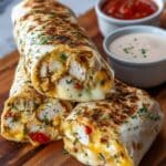 Deliciously cheesy and garlicky chicken wraps packed with tender diced chicken sautéed in olive oil and garlic, blended with gooey melted mozzarella and cheddar cheeses, all wrapped in warm flour tortillas and pan-fried to golden, crispy perfection. Perfect for a satisfying lunch or dinner that’s quick and easy to prepare.