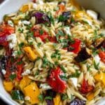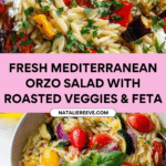 Keywords: Orzo salad, roasted vegetables, feta cheese, Mediterranean salad, healthy pasta salad, lemon vinaigrette, vegetarian dish