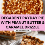 This delicious Payday Pie features a flaky baked pie crust filled with a rich, creamy peanut butter and marshmallow mixture, topped with crunchy roasted peanuts and a homemade buttery caramel drizzle. Perfect for peanut butter lovers, this indulgent dessert combines sweet and salty flavors and textures in every bite.