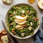 This Pear Salad with Blue Cheese and Rocket is a fresh and flavorful combination perfect for a light lunch or elegant starter. Juicy pears, crunchy toasted walnuts, peppery rocket, and creamy blue cheese come together with a tangy honey mustard dressing for a delicious balance of textures and tastes.