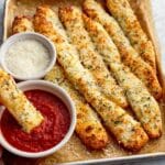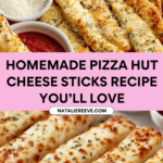 Recreate the classic Pizza Hut Cheese Sticks with this easy homemade recipe featuring soft, buttery dough topped with a generous blend of mozzarella and Parmesan cheeses, seasoned with garlic and oregano, baked to golden perfection and served warm with marinara sauce for dipping.