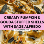 Keywords: Pumpkin stuffed shells, Gouda cheese pasta, brown butter Alfredo, sage Alfredo sauce, baked pasta dish, autumn recipes, creamy pumpkin pasta