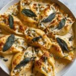 Delight in the cozy flavors of Pumpkin & Gouda Stuffed Shells baked in a rich brown butter and sage Alfredo sauce. This comforting Italian-inspired dish features jumbo pasta shells filled with a creamy blend of pumpkin puree, ricotta, smoked Gouda, and fresh sage, baked to perfection and topped with a luscious Alfredo sauce made from brown butter, heavy cream, and Parmesan. Perfect for fall dinners or a special family meal.