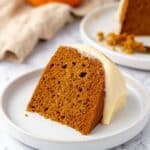 A single slice of moist pumpkin cake with a deep orange-brown color sits on a simple white round plate. The cake has one visible thick layer with a dense texture and small air holes throughout. At the base of the slice is a smooth layer of pale cream-colored frosting that wraps around the bottom edge. In the background, there is another slice on a white plate with some crumbs scattered nearby, and a small orange pumpkin sits on a beige cloth, all set on a white marbled surface. photo taken with an iphone --ar 4:5 --v 7