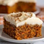 A close-up of a single square piece of carrot cake on a white plate, showing two layers: the bottom layer is moist, coarse textured orange-brown cake with visible carrot bits, and the top layer is thick, smooth cream cheese frosting in an off-white color with a lightly dusted sprinkle of cinnamon on top. In the background, another blurred square piece of similar carrot cake is visible. The surface is a white marbled texture. photo taken with an iphone --ar 4:5 --v 7