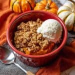 This Pumpkin Crisp is a deliciously comforting autumn dessert featuring a creamy pumpkin filling topped with a crunchy oat, pecan, and cinnamon streusel. Baked to a golden perfection and served warm with your choice of vanilla or pumpkin ice cream, or whipped cream, it’s a perfect treat to enjoy during the fall season.