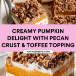 Keywords: pumpkin dessert, layered pumpkin dessert, pecan crust dessert, no-bake pumpkin cheesecake, fall dessert, holiday dessert