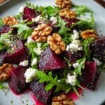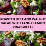 This vibrant Roasted Beet and Walnut Salad features tender, oven-roasted beets paired with crunchy toasted walnuts, creamy crumbled feta, and fresh mixed greens. Tossed with a tangy lemon-balsamic vinaigrette and garnished with fresh herbs, this salad offers a refreshing balance of sweet, savory, and nutty flavors, perfect as a light meal or an elegant appetizer.