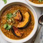 - Assemble and Serve: Ladle the split pea stew into serving bowls. Top with the roasted squash wedges and toasted pepitas. Drizzle with extra virgin olive oil and garnish with fresh cilantro leaves before serving.