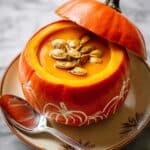 - Serve: Pour the creamy pumpkin soup into the hollowed pumpkin bowls or regular soup bowls. Top with the roasted pumpkin seeds for a crunchy garnish and serve warm.