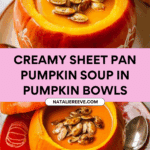 This Sheet Pan Pumpkin Soup is a cozy and flavorful fall recipe that combines roasted pumpkins, squash, carrots, apples, and aromatic spices. Roasted on a single sheet pan and blended smooth with creamy coconut milk and vegetable broth, it makes a comforting and dairy-free soup served right inside roasted pumpkin bowls for a festive presentation.