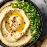 - Garnish and Serve: Drizzle a little olive oil on top of the skordalia, sprinkle with red pepper flakes, and garnish with the finely sliced green onion tops. Serve the dip warm alongside chips, pita bread, or chopped vegetables for dipping.