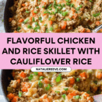 This Chicken and Rice Skillet is a flavorful, one-pan meal combining tender ground chicken, a medley of sautéed vegetables, brown rice, and cauliflower rice. Enhanced with a blend of spices and a creamy sauce made from reduced-fat cream cheese and hot sauce, this dish is both comforting and nutritious. Topped with fat-free cheddar and fresh scallions, it’s a perfect weeknight dinner that’s quick to prepare and packed with wholesome ingredients.