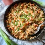 This Chicken and Rice Skillet is a flavorful, one-pan meal combining tender ground chicken, a medley of sautéed vegetables, brown rice, and cauliflower rice. Enhanced with a blend of spices and a creamy sauce made from reduced-fat cream cheese and hot sauce, this dish is both comforting and nutritious. Topped with fat-free cheddar and fresh scallions, it’s a perfect weeknight dinner that’s quick to prepare and packed with wholesome ingredients.