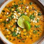 A bowl of orange-yellow corn soup filled with visible corn kernels and small green herb pieces spread throughout, topped with white crumbled cheese and scattered red spice flakes. Two bright green lime wedges sit on the surface near the center, surrounded by fresh green chopped herbs sprinkled evenly on top. The soup is served in a white bowl with a rustic brown speckled rim, placed on a white marbled texture. photo taken with an iphone --ar 4:5 --v 7